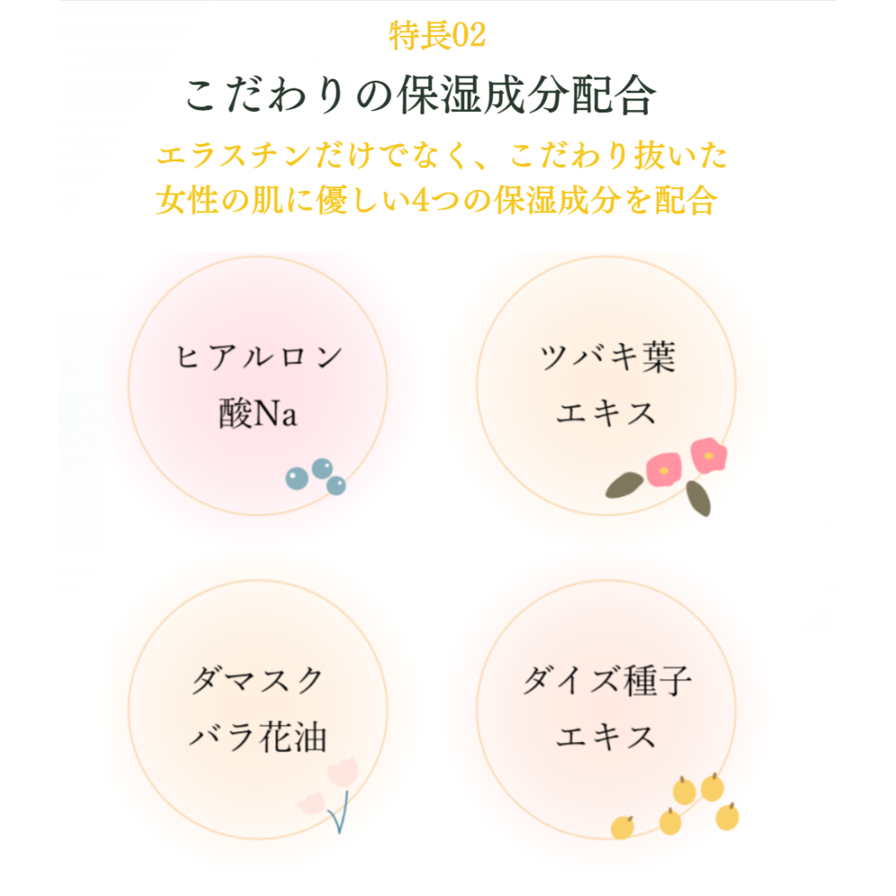 成分 : 水、グリセリン、スクワラン、BG、ジグリセリン、ペンチレングリコール、ラウロイルグルタミン酸ジ(フィトステリル/オクチルドデシル)、カルボマー、フェノキシエタノール、(アクリル酸ヒドロキシエチル/アクリロイルジメチルタウリンNa)コポリマー、ポリソルベート60、イソステアリン酸ソルビタン、酢酸トコフェロール、シクロペンタシロキサン、10-ヒドロキシデカン酸、セバシン酸、1,10-デカンジオール、加水分解エラスチン、ヒアルロン酸 Na、加水分解コラーゲン、ツバキ葉エキス、ダイズ種子エキス、ダマスクバラ花油、オニサルビア油、水酸化 Na