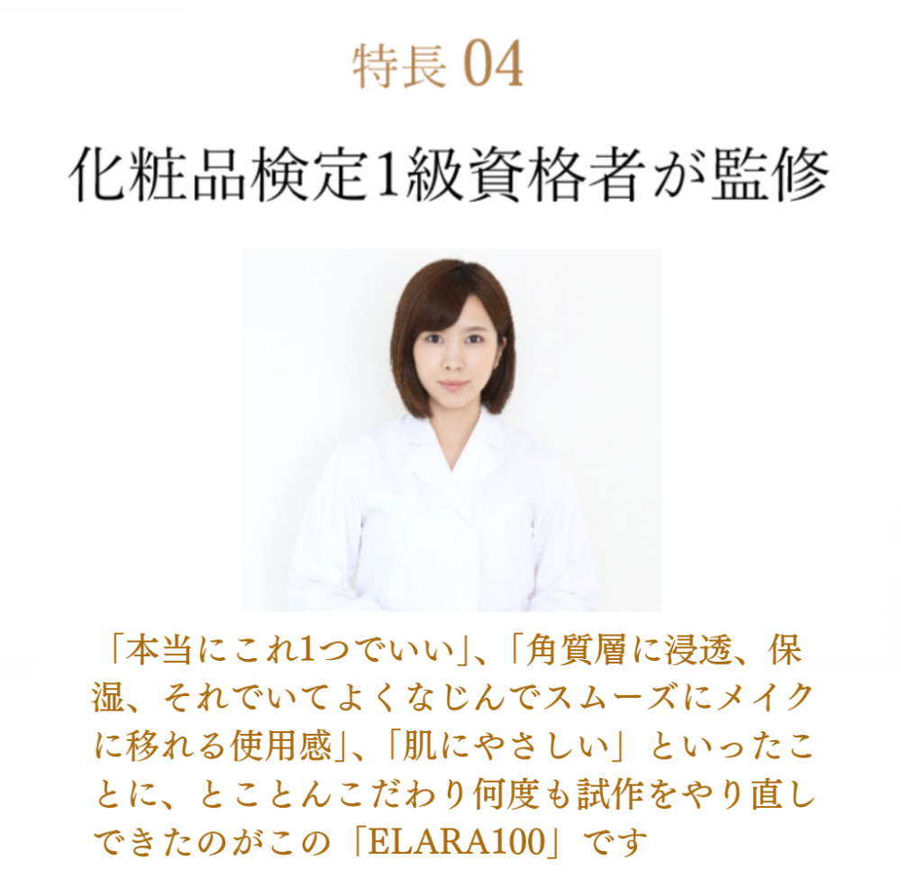 あなたのお肌を守り、育てる「ELARA100」。忙しい日常でも、ひと塗りで高保湿が続くELARA100をぜひお試しください。素肌が美しく整うと、毎日のメイクも一段と映え、日々のコミュニケーションを快活にします。お肌の未来を見据えたスキンケアを、今すぐ始めませんか?