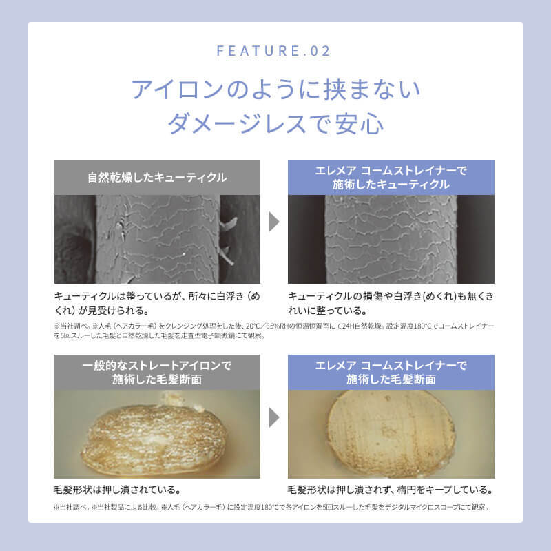 髪を押しつぶさない設計で、ダメージを抑えながらキューティクル・髪のキメ・面を整えます。