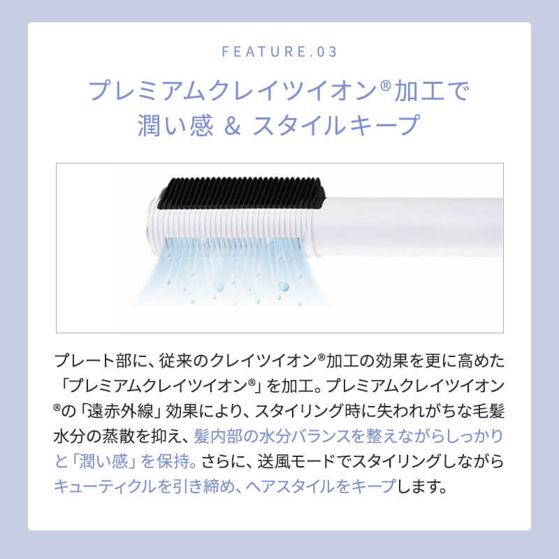 プレート部に、従来のクレイツイオン(R) 加工の効果を更に高めた「プレミアムクレイツイオン(R)」を加工。プレミアムクレイツイオン(R) の「遠赤外線」効果により、スタイリング時に失われがちな毛髪水分の蒸散を抑え、髪内部の水分バランスを整えながらしっかりと「潤い感」を保持。さらに、送風モードでスタイリングしながらキューティクルを引き締め、ヘアスタイルをキープします。