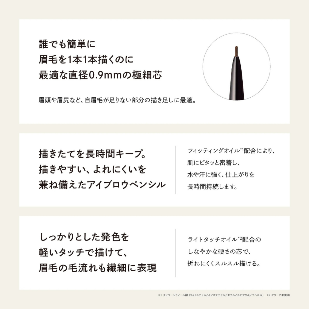 PARISBROW人気No.1アイテム狙ったところに毛を一本描き足すことができる0.9mmの業界最細ペンシル。 眉頭や眉尻、自眉毛が足りない部分の隙間に最適です。