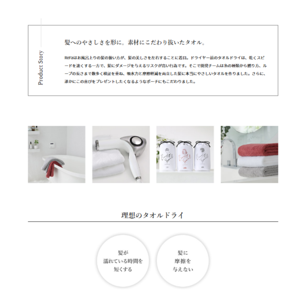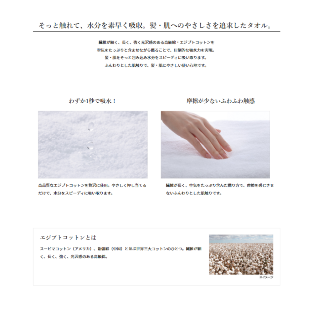 圧倒的な吸水力を実現。髪・肌をそっと包み込み水分をスピーディに吸い取ります。