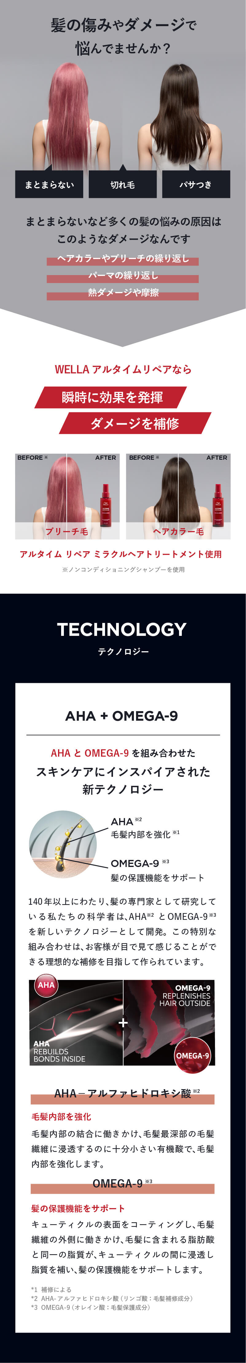 毛髪内部を強化(*1)するAHAと、髪の保護機能をサポートするOMEGA-9の特別な組み合わせは、目で見て感じることができる理想的な補修を目指して作られています。