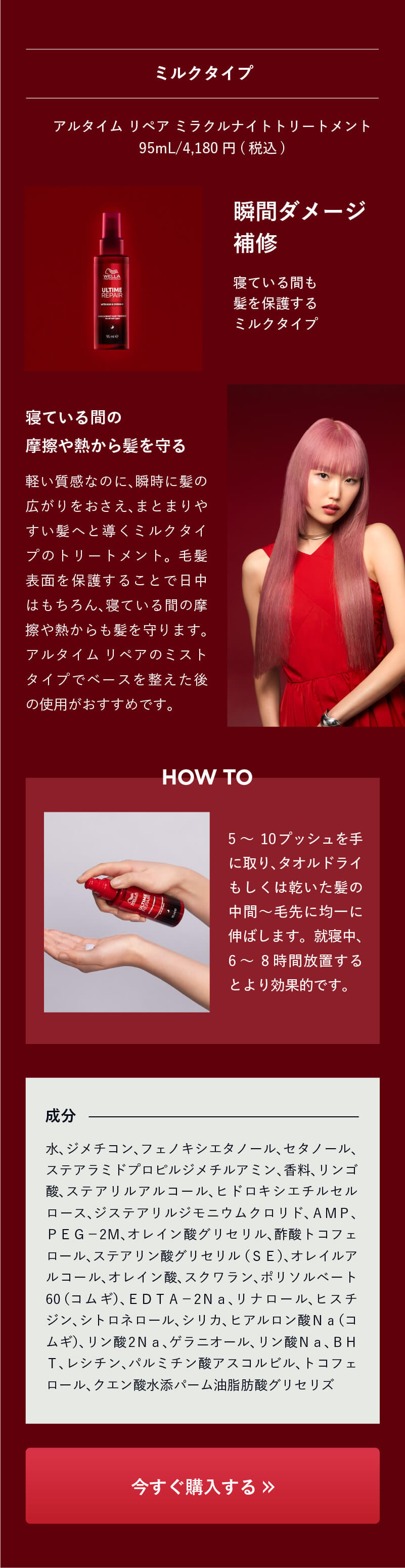 瞬間ダメージ補修、寝ている間も髪を保護するミルクタイプ。