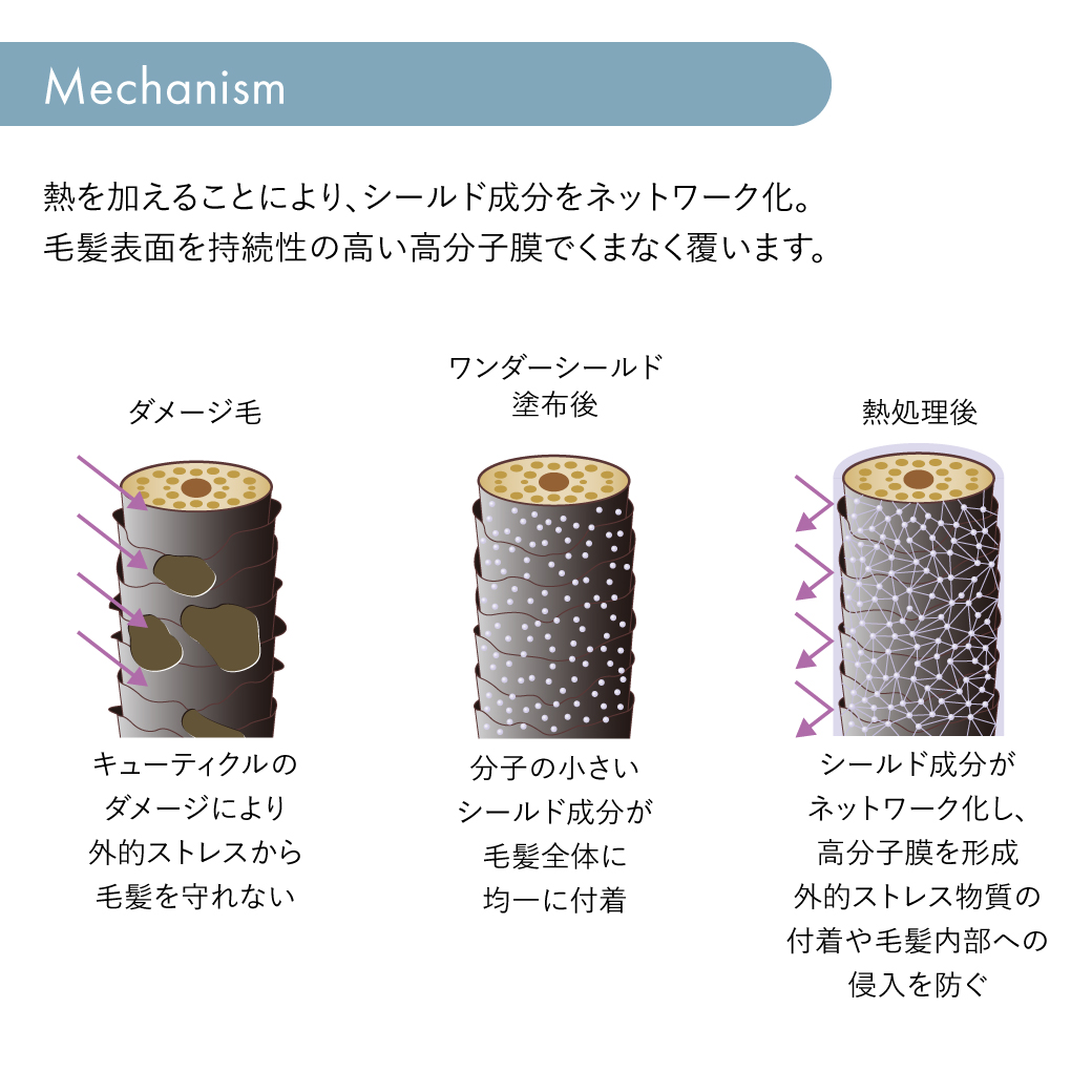 日常生活で避けることのできないさまざまな外的ストレスから髪を守りながら、トリートメント効果を髪に閉じ込める独自テクノロジーを搭載。