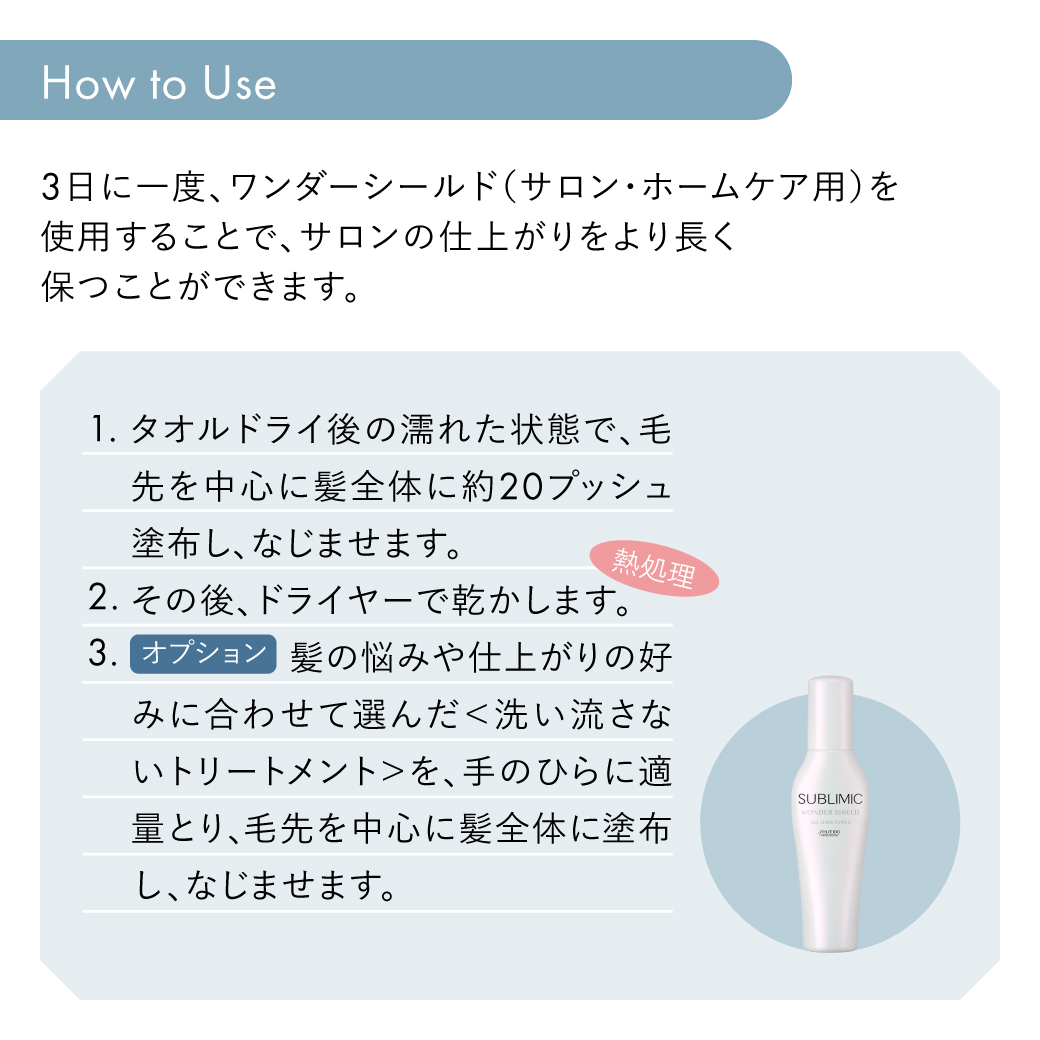 2. ドライヤーで乾かします。ドライヤーの熱と反応し、シールド成分がプロテクト膜を髪表面に形成します。